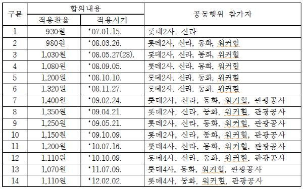 이후 5년여 동안 총 14차례의 적용환율 및 그 적용시기를 담합해오던 중 신라가 2011년 5월에 롯데·동화 등 나머지 7개 면세점 사업자는 2012년 2∼3월에 담합을 중단했다.