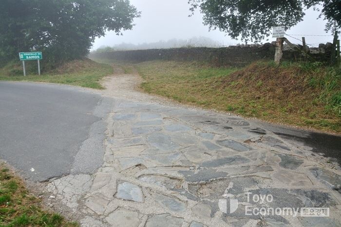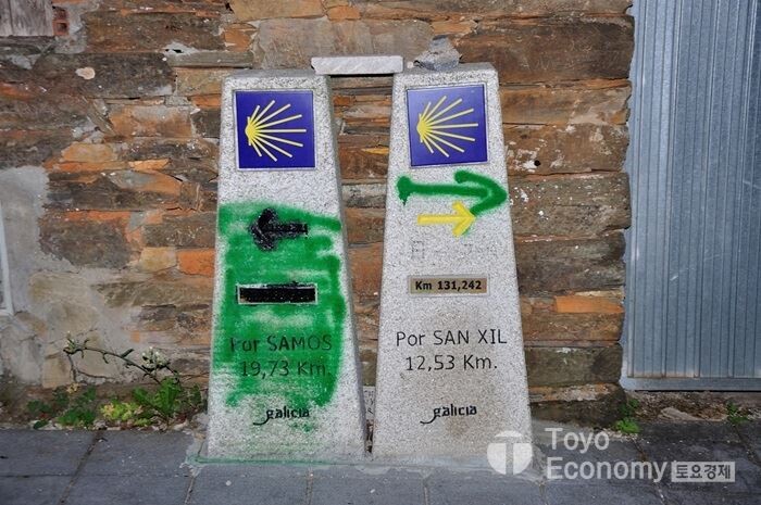 순례길은 한 코스가 하나의 길로 이어진줄 알았었다. 하지만 막상 다녀보니 우회길 또는 갈림길이 존재했다. 날씨 또는 안전을 위해 만들어 놓은 길도 있지만, 길의 의미를 부여해주고 부각해주는 지역을 찾아가기 위해 여분의 길을 만들어 놓기도 한다. Triacastela에서 Sarria 2개의 코스가 존재한다. Por Sanxil 과 Par Samos 로 마을을 벗어나기 직전에 양방향으로 노란색화살표가 설치된 곳을 마주한다. 나와 일행을 고민할 것도 없이 Por Sanxil 루트로 가기로 했다. 예전에도 일행한테 얘기했듯이 좀더 짧은 코스로 가기위해 선택하였다고 설명해주었다. 하지만 순례길의 역사와 문화를 좀더 알고자 하는 사람들이라면 Samos에 있는 수도원을 경유하는 코스로 가야한다. 전자의 코스보다 약 7km 정도 긴 25km의 거리를 평지구간으로 걸어야 한다.