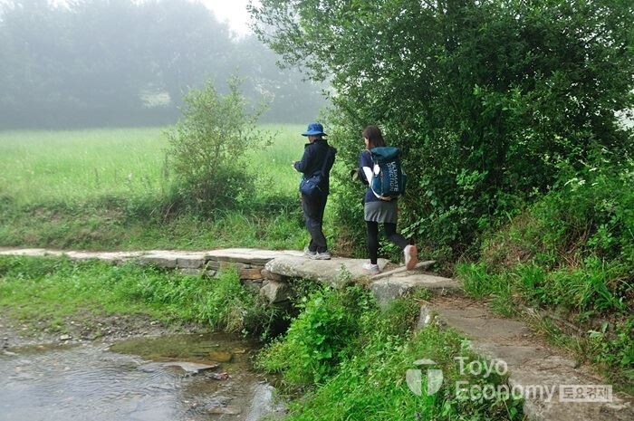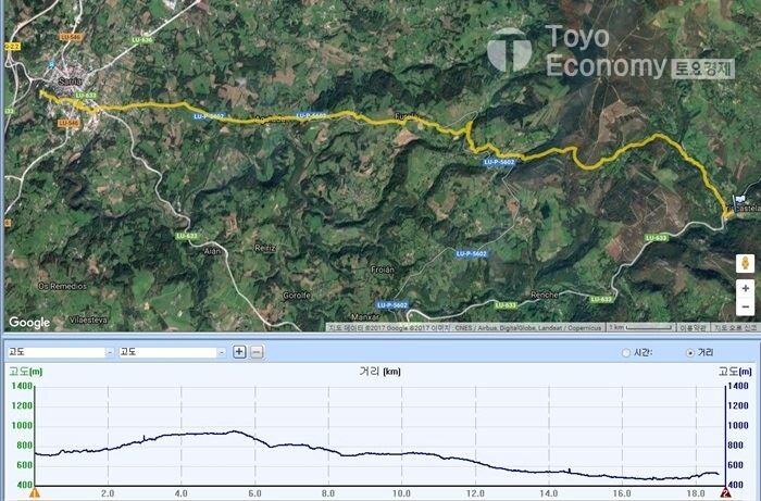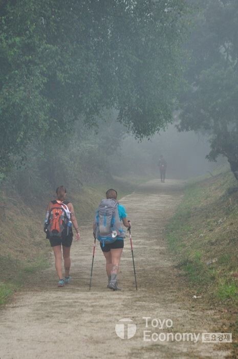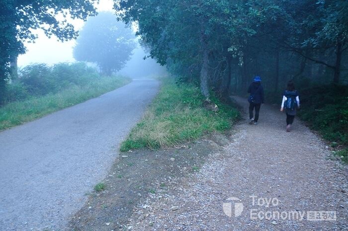 초반 오르막을 오르는 동안은 어둠이 짙게 내려와 헤드랜턴에 의지하며 걸어야 했다. 가로등도 없고 민가에 불빛조차 없는 그런 숲길이다. 일행 뒤편에 다른 순례자들이 켜놓은 작은 헤드랜턴 불빛이 일렬로 다가오는 모습은 도깨비불이 우리를 따라 오는것처럼 보일정도이다. 우리는 그 불빛을 따라 서로 앞서거니 뒷서거니 하며 어두운 숲길을 헤쳐갔다. 그리고 한 두 시간이 지나서야 해가 떠오르기 시작하여 주변이 밟아졌다. 갈리시아 지방은 평지가 없는 구릉과 산지가 연이어 있는 곳이다. 그래서 예전처럼 평지에 뜨는 일출은 볼 수 없다. 대신 숲이 많아 더운 날에도 시원하고 상쾌하게 걸을 수 있는 지역이다. 그러다 보니 숲길,둘레길을 걷기 좋아하는 한국사람들에게는 가장 어울릴만한 곳도 갈리시아 지방의 순례길이다.