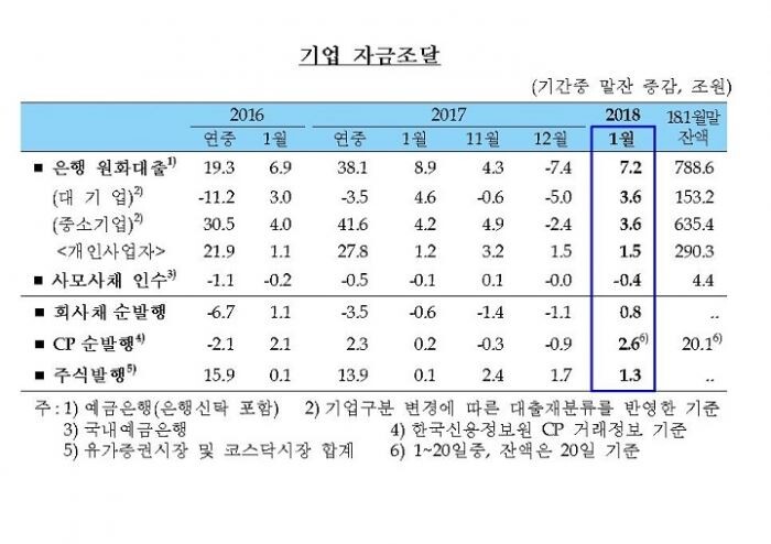 9일 한국은행이 발표한 '2018년 1월중 금융시장 동향'에 따르면 1월말 기준 은행 기업대출은 788조6000억원으로 집계됐다. 1월에만 7조2000억원이 불어나며 작년 12월 마이너스 7조4000억원에서 증가세로 돌아섰다.