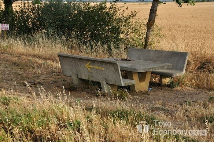 그냥 평지같은 길이라고 생각했는데 점점 고도가 높아지는 오르막 길이다. 경사가 있음을 느낄 수 없을 만큼 완만하게 이어가는 길이다. Calzadilla de la Cueza에 가까이 왔을때 높은 곳에 올라왔음을 경험했다. 마을이 언덕아래에 있기 때문이다. 사막처럼 건조하고 막막한 길, 흙먼지가 일어나지만 기분 나쁘지는 않은 곳, 길 옆 작은 숲에 쉼터가 간간히 있어 휴식을 취할 수 있는 것만으로도 다행이고 행복한 길이다. 더우기 푸드트럭이 보일때면 탄성을 내지를 수 있는 곳이 여기다. 우리는 푸드트럭을 지나 계속 걸었다. 아침을 먹고나니 굳이 사먹거나 cafe con leche가 당기지 않았다.