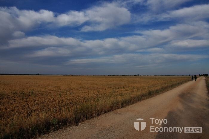 오늘 걸어야 하는길도 직선에 쭈욱 뻗은 길이다. 언덕도 없고, 가로수도 별로 없다. 새벽이라 시원한 기운이 땅에 머물고 있어 덥지 않은 기분으로 걸을 수 있다. 오후가 되어도 높은 지대의 특성때문에 햇빛은 뜨겁지만 시원한 바람이 계속 불어와 덥다는 느낌을 받을 수 없었다. 아마 7월이 되어도 이곳은 선선한 날씨가 이어지지 않을까 싶다. 여름이라고 얇은 옷만 준비했다가는 얼어죽을 수 있는 곳이 여기라고 생각한다.