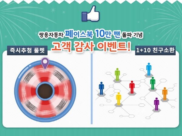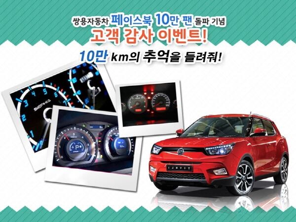 이와 관련 쌍용차는 ▲쌍용차와 함께 하고 싶은 10명의 친구를 초대하는 '친구소환 1+10 이벤트' ▲매일 10명에게 커피 기프티콘을 증정하는 '행운의 룰렛' ▲10만km에 가장 근접한 주행거리가 표시된 인증샷을 공유하는 팬에게 추첨을 통해 주유상품권과 오일교환권을 증정하는 등 오는 30일까지 다양한 고객참여 이벤트를 실시한다.