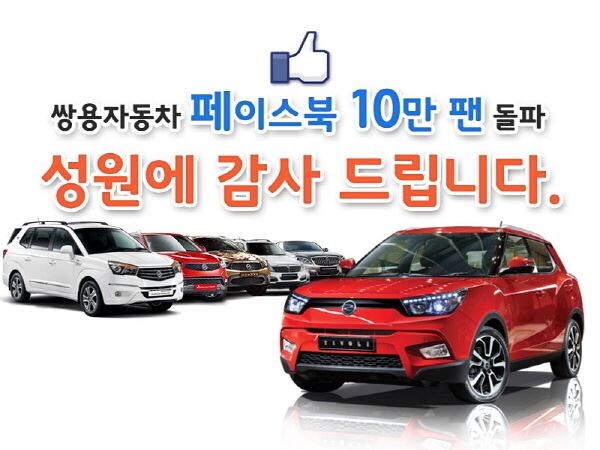 [토요경제=송현섭 기자] 쌍용자동차가 지난 2011년 양방향 소통을 위한 공식 페이스북 오픈 3년6개월만에 페이지 팬 10만명을 돌파했다고 26일 밝혔다.