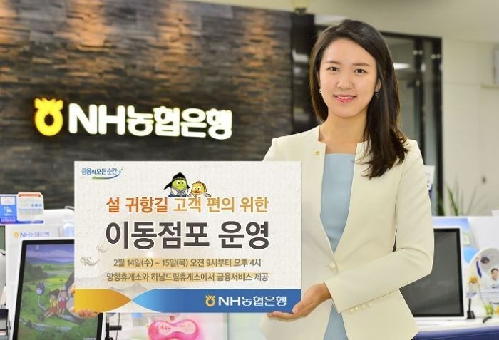 [토요경제=유승열 기자] NH농협은행은 설 연휴를 맞아 고향을 방문하는 고객의 금융편의를 위해 14, 15일 오전 9시부터 오후 4시까지 경부고속도로 부산방향 망향휴게소와 중부고속도로 통영방향 하남드림휴게소에서 이동점포를 운영한다고 12일 밝혔다.