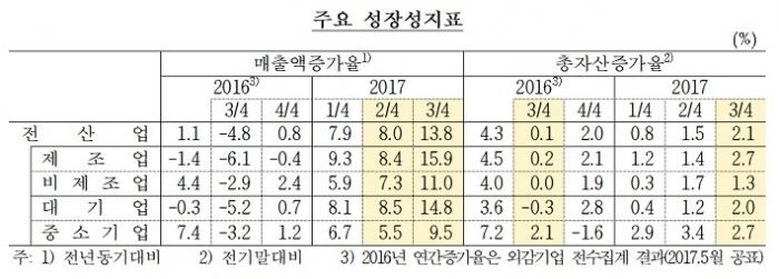 대기업은 2분기 8.5%에서 3분기 14.8%로, 중소기업은 5.5%에서 9.5%로 매출액 증가율이 확대됐다.