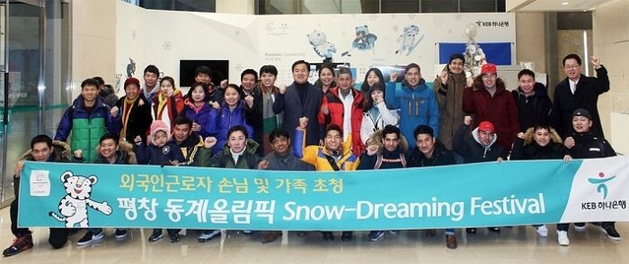 [토요경제=유승열 기자] KEB하나은행은 국내거주 외국인근로자 및 가족을 초청해 동계올림픽을 관람하고 체험하는 '평창 Snow-Dreaming Festival'을 진행하고 있다고 12일 밝혔다.