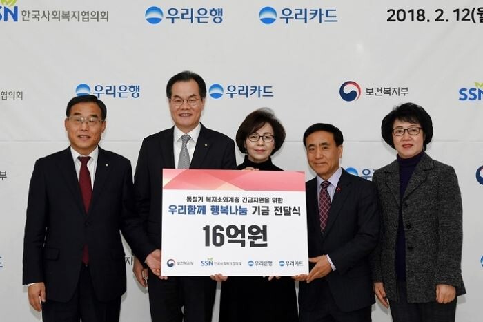 우리은행과 우리카드·보건복지부·한국사회복지협의회는 지난 2014년 3월 '나눔문화 확산을 위한 업무협약'을 체결했고, '우리함께 행복나눔 금융상품'을 통해 고객들의 이자 및 포인트를 기부받아 기금을 조성했다. 지난해 연말까지 전국에서 약 58만명의 고객이 기부에 참여해 총 16억9000여만원의 기금을 마련했다. 이날 전달된 '우리함께 행복나눔 기금'은 전국 각 사회복지협의회를 통해 동절기 복지소외계층에게 식생활, 수도⋅전기⋅난방비, 의료비 등으로 지원될 예정이다.