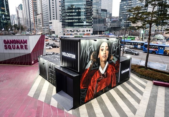 현대자동차 신형 벨로스터 홍보를 위해 서울 강남역 강남스퀘어에 설치된 프라이빗 쇼룸 벨로박스 전경. <사진=현대자동차>