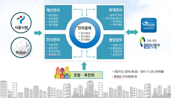 예를 들어 정비조합 임·직원은 시스템에 접속, ▲예산(편성, 변경, 장부) ▲회계(결의서·전표 작성, 전자세금계산서, 회계장부, 제무제표) ▲인사(인사정보, 급여관리, 증명서관리) ▲행정(조합원명부, 물품관리대장, 정기총회일정 등) 분야의 문서생산‧접수‧발송 업무를 처리하게 된다.