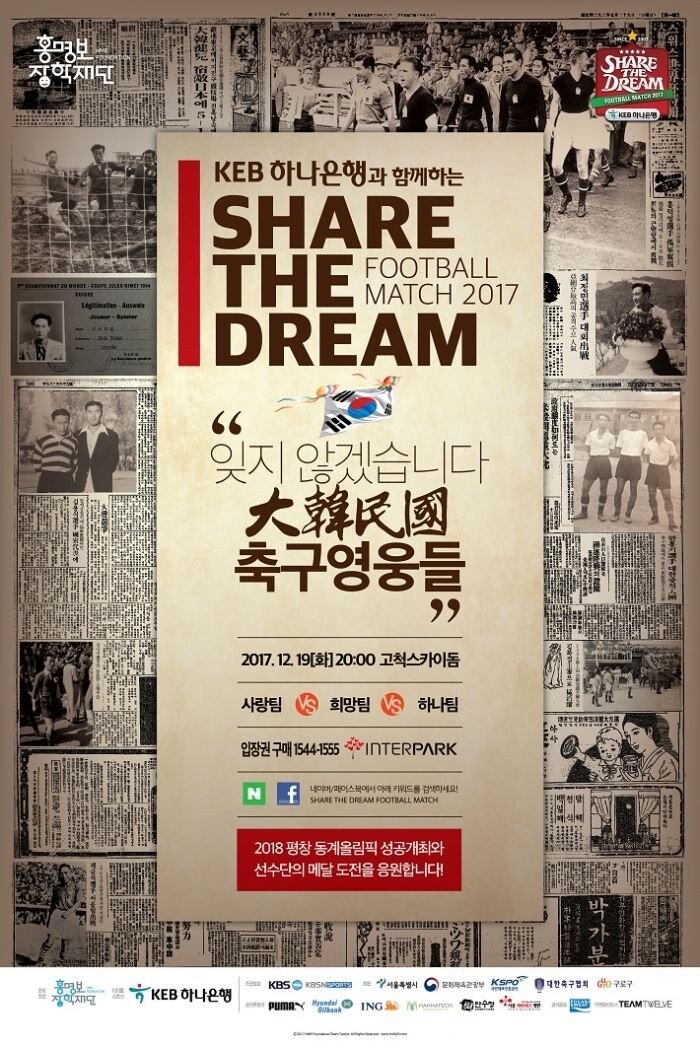 [토요경제=유승열 기자] KEB하나은행은 19일 고척 스카이돔에서 열리는 '홍명보 자선축구 경기', 'KEB하나은행과 함께하는 2017 셰어 더 드림 풋볼 매치(SHARE THE DREAM FOOTBALL MATCH 2017)'를 후원한다고 18일 밝혔다.