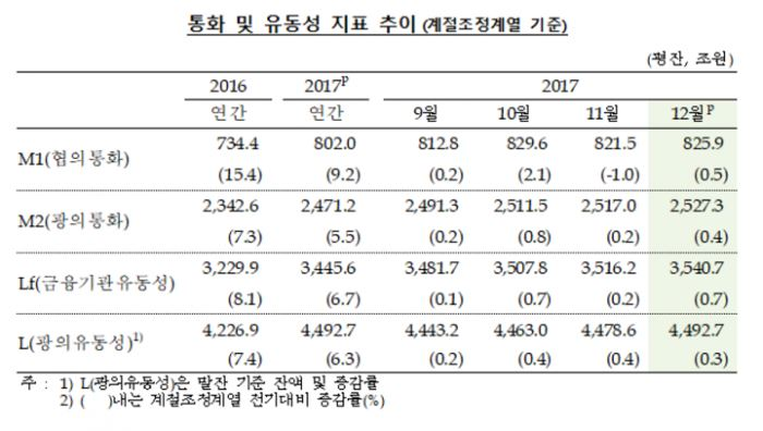 13일 한국은행이 발표한 '2017년 12월중 통화 및 유동성'에 따르면 지난해 통화량(M2·광의통화)의 평균잔액(원 계열 기준)은 2471조2256억원으로 전년보다 5.5%(128조643억원) 증가한 것으로 나타났다.
