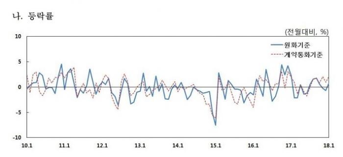 환율 영향을 제거한 계약통화(실제 계약할 때 쓰인 통화) 기준 수입물가는 2.1% 상승했고 수출물가는 1.2% 올랐다.