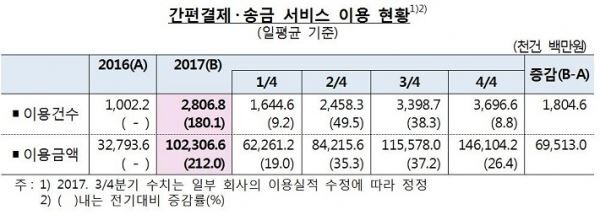 3일 한국은행의 '2017년 중 전자지급 서비스 이용 현황'에 따르면 지난해 간편결제·송금 서비스 이용금액하루 평균 1023억 원으로 전년의 328억 원보다 3.1배로 증가했다.