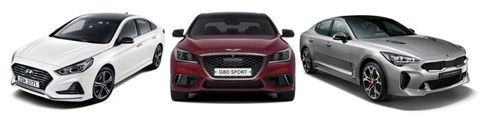 왼쪽부터 쏘나타 뉴라이즈, G80스포츠, 스팅어. <사진=현대자동차그룹>