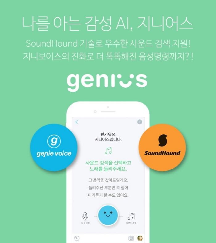 지니뮤직은 미국 음성인식 AI 기술 기업인 사운드하운드와 기술제휴를 맺고 지니 앱에 고도화된 감성AI 통합서비스 ‘지니어스’를 적용했다.
