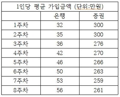 그러나 가입금액이 매주 하락하며 출시 초기에 300만원에 달했던 1인당 평균 가입금액이 약 14% 감소한 261만원으로 나타났다.