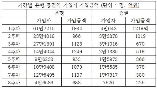 은행권이 넓은 점포망과 많은 영업인력을 통해 꾸준한 가입자 유치와 가입금액을 유지했으나 증권업계의 모든 실적이 갈수록 감소한 것이다.