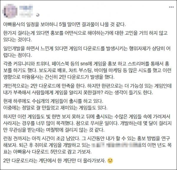 한 인디게임 개발자가 신작 출시를 앞두고, 페이스북에 올린 글이 개발자 사이에서 공감을 얻고 있다.