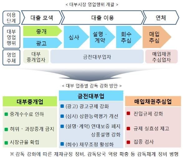 대부업자의 허위·과장 설명을 차단하기 위한 법적 근거도 마련했다. 대부중개업자의 다단계 중개를 막아 책임소재를 분명히 하고 중개인을 한 개 회사에 전속되도록 함으로써 대출 쪼개기 등 불건전 행위를 차단하기로 했다.