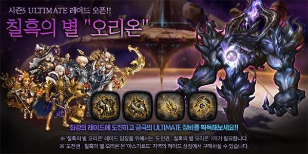 이번 업데이트를 통해 시즌 5 최종 레이드 칠흑의 별 오리온을 공개했다. 레이드 오픈을 기념해 오는 11일까지 하루 2회 정해진 시간 동안 레이드 정수를 획득할 수 있는 버프를 적용하고, 클리어 시 Ultimate급 장비를 획득할 수 있다.