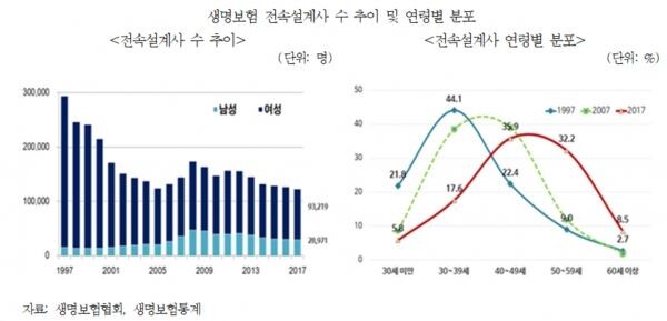 이 연구원 안철경 선임연구위원은 "젊은층 신규 채용에 어려움을 겪으면서 경력 단절 여성을 대상으로 한 영업조직 운영이 늘어난 것도 여성 설계사 고령화의 한 원인"이라고 분석했다.