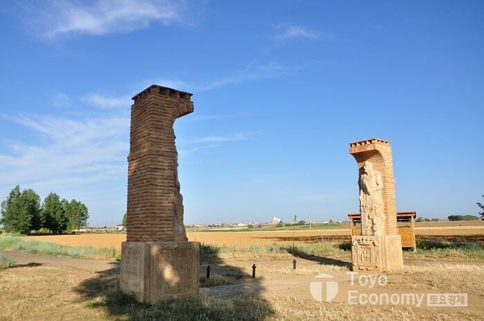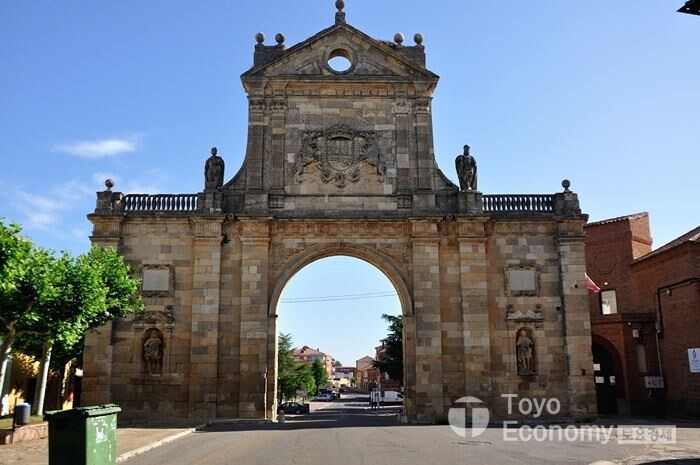 바다바람님을 태워 보내고 우리는 자기만에 걷는 모습으로 Sahagun으로 향했다. 프랑스길의 중간지점이 이곳이다. Sahagun은 파꾼도 성인인 베르나르디노 데 사아군에서 유래했다고 알려져 있다. 프랑스의 성 베네딕토회의 산 베니또 수도원이 이곳에 자리를 잡으면서 도시는 까미노와 함께 성장했다고 알려져 있으나 현재는 시계탑만 남아있는 수도원 유적과 아름다운 무데하르 양식의 유적들, 그리고 도시 입구의 커다란 아치만이 남아있다. Sahagun으로 접어드는 길이 여럿 갈래가 있다. 도로를 따라가다 표시판을 보고 오른쪽으로 돌아 다리를 건너가야 하는데 도로따라가다 다른 길로 접어드는 길도 있다. 그래서 우리 일행도 나와 테스님만 아치와 작은 성당을 만났고 다른 일행은 그냥 지나쳐 버렸다. 갈래길이 나타날때는 원래의 길을 따라가는것이 가장 좋은 풍경이나 유적을 만날 수 있음을 이제는 경험으로 알고 있다.
