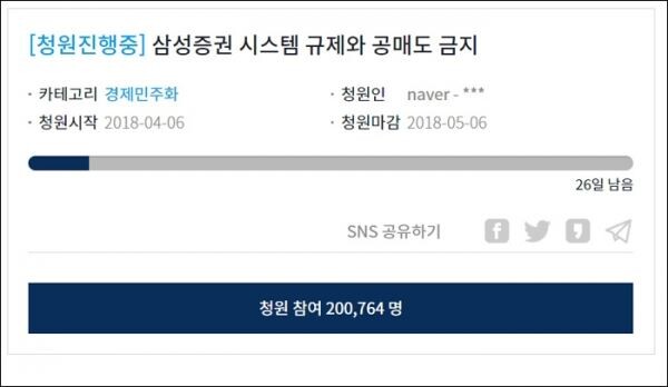 10일 자정 현재 '삼성증권 시스템 규제와 공매도 금지'라는 제목의 청원에 20만 명 이상이 참여했다.