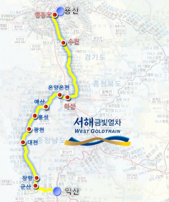 서해금빛열차는 서울 용산역을 출발해 장항선을 따라 아산·예산·홍성·보령·서천·군산·익산 등 서해 7개 지역의 보석 같은 관광지를 찾아 떠나는 관광전용열차다.