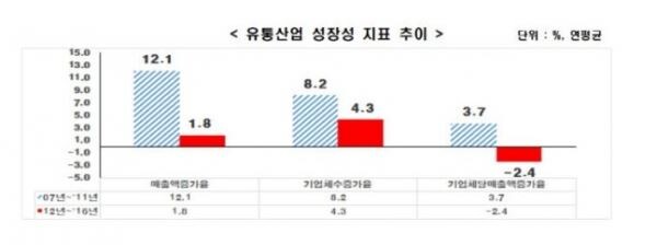 유통기업당 매출액의 경우 2007∼2011년 연평균 3.7% 증가한 반면 2012∼2016년에는 오히려 2.4% 감소했다.