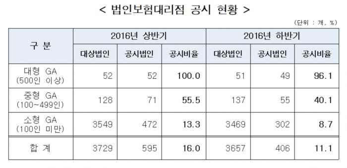실제로 금융위원회에 따르면 지난 2016년 하반기 기준 GA 공시 의무 이행 비율은 11.1%로 집계됐다. 공시의무 대상인 3657곳의 GA 가운데 제대로 공시를 한 곳이 406곳에 불과한 것이다. 규모별로 살펴보면 대형 GA(51개사) 96.1%, 중형 GA(136개사) 40.1%, 소형 GA(3469개사) 8.7%로, 규모가 작을수록 공시 의무를 제대로 이행하지 않고 있는 것이다.