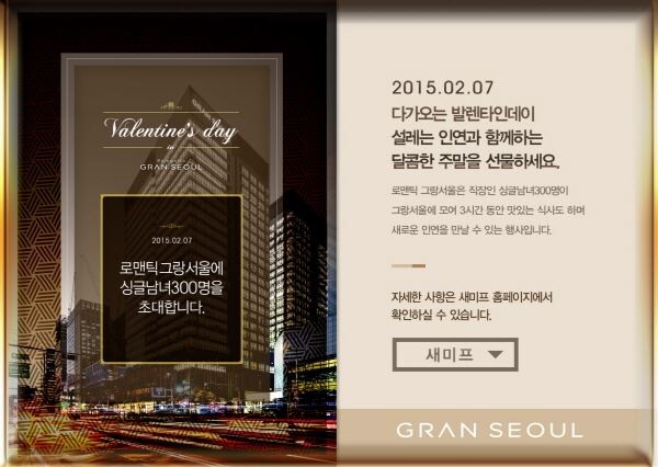 '발렌타인데이 in 로맨틱 그랑서울'로 명명된 이번 행사는 그랑서울 몰 활성화를 위해 기획된 것으로 지난해 10월에도 싱글 남녀 직장인 200명을 대상으로 처음 개최된 바 있다.