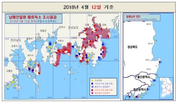 이에 따라 이 해역에서의 패류 채취가 금지됐다. 지금까지 패류독소 기준치를 초과한 품종은 홍합, 굴, 바지락, 미더덕, 개조개, 키조개, 가리비, 피조개, 멍게 등 9종이다.