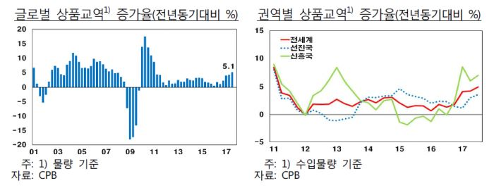 우선 상품물량 교역증가율은 작년 상반기 1%선에서 올해 상반기 4.1%, 3분기 5.1%로 확대돼 중국 등 아시아 신흥국 교역이 급증했고 자원 수출국이나 미국·유로권도 호조를 보이고 있다.