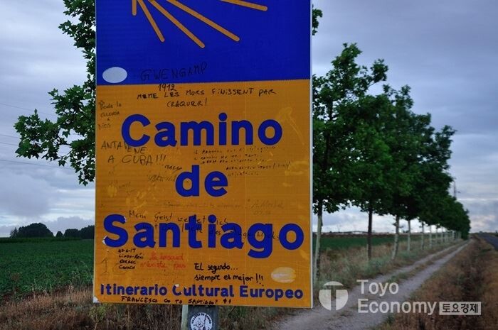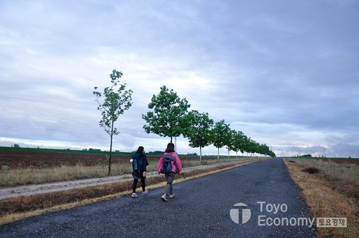 여지껏 운이 좋아 비를 만난적이 없었다. 비가 내려도 오전에 잠깐이거나 알베르게에 도착하고 쉬고 있을 저녁에 비가 내려 걷는데 수월했다. 북쪽길 걸을때에 비하면 천국에서 걷는 기분이랄까.... 어둑한 새벽에 구름이 낮게 드리워져 있어 음침하고 기온이 내려가 여름이라고 느껴지지 않았다. 다행인건 가로수 없는 순례길에 햇빛이 없어 걷기 좋다는 것...