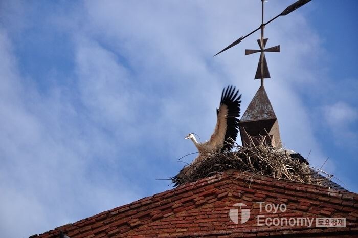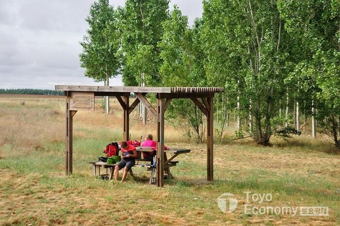 더 오래 있기에는 시간이 부족했다. 오늘 가야할 거리가 만만치 않기에 아쉬움을 남겨두고 Bar를 나섰다. 도심을 가로질러 나가는 데 첨탑위에 황새 둥지가 많이 보였다. 이곳은 황새가 많은지 교회 첨탑처럼 높은 곳에는 어김없이 둥지가 보였다. 인위적으로 만든 첨탑에 둥지가 만들어진 것도 보았다. 오늘은 다른 날에 비해 유달리 많아 보인다. 한국에는 보이지 않는 새가 이곳에는 이렇게 많다니 놀랍기도 하다. 그리고 누런 밀밭대신 노란꽃잎이 달린 해바라기가 고개를 들기 시작했다. 푸른 숲처럼 높은 해바라기 농장이 드넓게 펼쳐져 있다. 이곳은 무슨 농장이던 상상하는것 이상으로 넓고 넓었다. 로그로뇨를 지날때 보았던 포도농장이 무척이나 넓었는데 대략 길이가 40km가 넘는다고 한다. 노란색 해바라기를 볼 수 있는 프랑스길이 있다고 하는데 아마도 여기가 아닐까 싶다. 7월이 되면 Mulas에 중세식 축제가 벌어진다고 하는데 축제와 함께 해바라기 활짝핀 모습을 상상해본다. 이곳도 너른 목장지대가 펼쳐져 있다. 푸른 숲이 있어 칙칙한 분위기를 조금 밝게 만들어 준다.