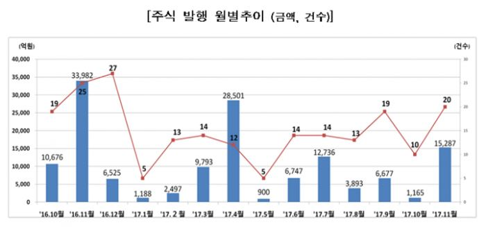 지난달 기업의 주식·회사채 발행 실적을 합하면 11조7천319억원으로 전월보다 8.9% 늘어난 수준이다. 올해 1~11월 누적 실적은 145조4609억원으로 지난해 동기보다 28.8% 증가했다.