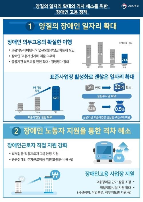 고용노동부의 며칠 전 발표에 따르면, 대기업일수록 장애인 고용 의무를 이행하지 않는 것으로 나타났다. 100∼299인 사업장의 지난해 고용 의무 이행률은 51.8%였으나 ▲300∼499인 사업장은 35.7% ▲500∼999인은 30.4% ▲1000인 이상은 21.4% ▲대기업집단 사업장은 19.2%에 불과했다.