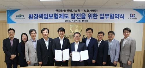 한국환경산업기술원과 보험개발원은 27일 서울 여의도 보험개발원에서 환경책임보험제도 발전 및 협력체계 강화를 위한 업무협약(MOU)을 체결했다.
