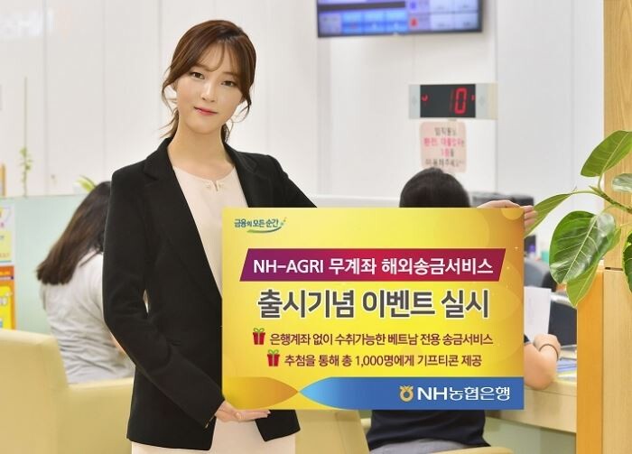 'NH-AGRI 무계좌 해외송금서비스'는 베트남 전용 송금서비스로, 계좌번호가 없어도 수취인이름과 송금번호(PIN NO.)만으로 2200여 베트남 아그리뱅크(AGRIBANK) 전 지점에서 수취가능하다. 외국인을 포함한 개인고객이면 누구나 전국의 농협은행 영업점 또는 올원뱅크 앱을 통해서 이용가능하다.