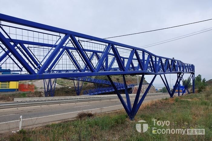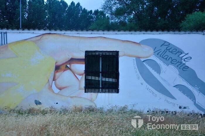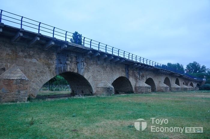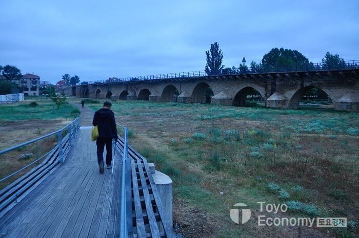 이른 아침부터 사람들이 부산하다. 흐린 하늘에 금새 비가 내릴것처럼 보인다. 얼마 걷지않아 Rio Porma앞에 기다란 다리를 만났다. 순례자가 다니는 길은 아니지만 보는것만으로도 조각품을 보는 것처럼 아름답다. 현대적인 재료와 고풍스런 석축이 만난 다리이다. 그 옆을 지나면서 다리의 풍경을 찍기위해 여기저기 돌아다녔다.