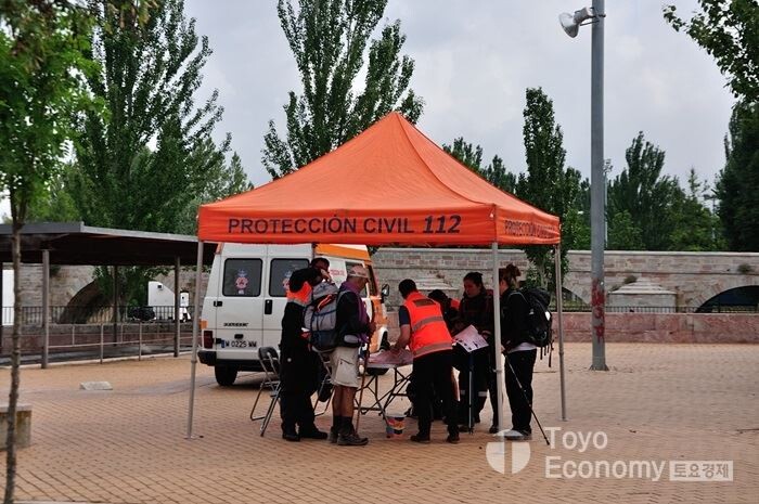 좀더 걷다보니 순례자를 도와주는 봉사대가 보였다. 다리를 다쳤다고 하니 다시 한 번 소독과 약을 발라주고, 정 힘들면 병원까지 데려다 주겠다고 한다. 태열맘님은 치료를 받고 그냥 걷겠다고 하고, 봉사자들에게 감사의 말을 한 뒤 알베르게를 향해 마저 걸었다.