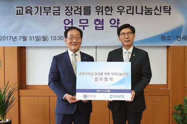 이날 협약은 교육 기부금 장려를 통한 나눔문화 확산을 위해 양 기관이 상호협력하기 위해 마련됐다. 협약에 따라 우리은행은 교육 기부금을 연세대에 기부할 수 있는 우리나눔신탁 상품을 기부자에게 제공하고, 연세대는 기부 희망자들을 우리은행에 추천해 우리나눔신탁 상품을 통해 기부할 수 있도록 협력하기로 했다.