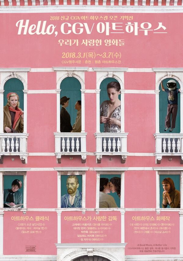 CGV아트하우스는 신규 오픈을 기념하며 CGV청주서문, 춘천, 평촌에서 기획전 및 프로모션을 실시한다. 먼저 다음달 1일부터 7일까지 스크린에서 다시 보고 싶은 아트하우스 작품들을 엄선해 ‘Hello, CGV 아트하우스 - 우리가 사랑한 영화들’ 기획전을 개최한다. 자세한 상영작과 시간표는 CGV홈페이지를 통해 확인 가능하다.