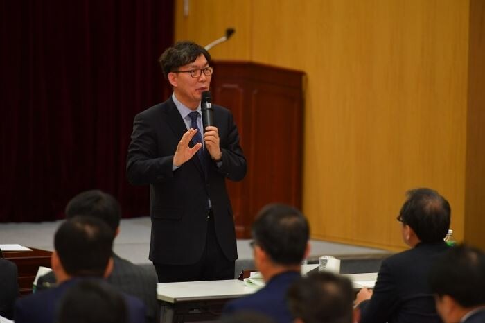 4일 서울시 중구에 위치한 NH농협은행 본점 대회의실에서 열린 '2018년 경영목표 달성회의'에서 이대훈 농협은행장이 경영목표에 대해 설명하고 있다.<사진=NH농협은행>