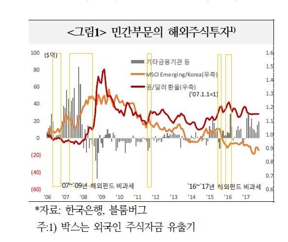해외 주식투자는 글로벌 금융위기가 닥쳤던 2008년 마이너스 71억달러를 기록한 뒤 2012년 146억달러로 올라섰다. 그러다가 지난해 209억달러로 불어났다.