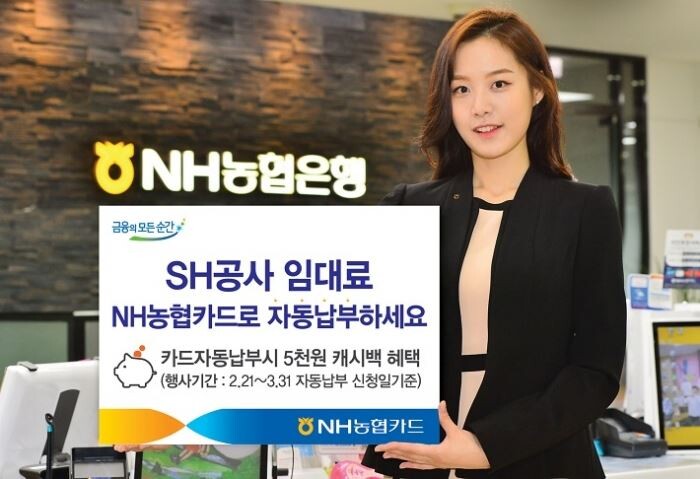 농협카드는 'SH공사 임대료 카드자동납부' 서비스 런칭을 기념해 농협카드로 자동납부를 신청한 고객에게는 5000원 캐시백(고객별 최초 1회)을 제공하는 프로모션을 실시한다.