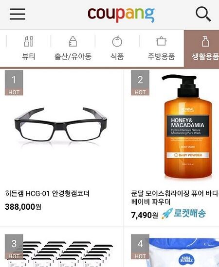 [토요경제=조은지 기자] 소셜커머스 업체 쿠팡에서 생활용품 추천 카테고리 1위 제품으로 ‘안경형 몰래카메라’가 소개돼 논란이 일고 있다.