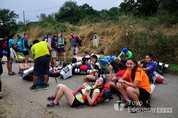 여기서도 많은 학생들이 보였다. 인솔자로 보이는 선생님도 보이는데 격이 없어 보인다. 무엇을 하더라도 선생님이 나서지는 않는다. 그저 같이 즐기는 듯 했다. 학생들도 나름 인솔자말에는 잘 따른다. 길바닥에 철푸덕 앉아 보카디요로 아침식사를 하는 모습을 간혹 보았지만 모두다 싱글벙글 즐겁다는 표정이다. 그리고 걷는 내내 별다를게 없다 강의도 없고 무얼 강의하는 사람도 없다. 오로지 순레길을 따라 걷는다.