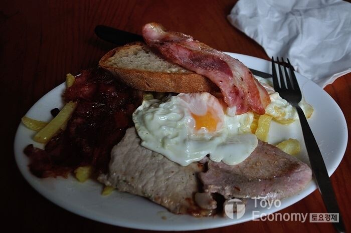 Gonzar부터 Bar에 불이켜져 쉬거나 아침식사를 할 수 있다. Bar에서 식사하는것이 일상화되다보니 나도 비상용이나 아침식사를 챙기는 것을 잊어 먹는다. 추운날에는 차가운 보카디요보다는 따스한 음식이 더욱 간절했다. 계란후라이와 베이컨과 감자칩이 콤비네이션을 이루는 이 음식... 미국스타일에 breakfast다. 4.5유로 이지만 어제 저녁을 술로 건너뛴 나한테는 해장국과 같았다. 예전 같으면 기름진 음식을 가렸을텐데 여기서는 그렇지 않다. 아무리 먹어도 빠지는 곳이 순례길이다.